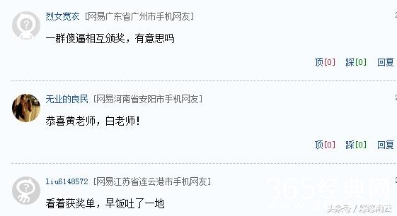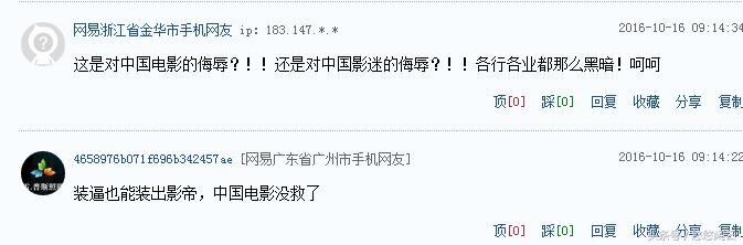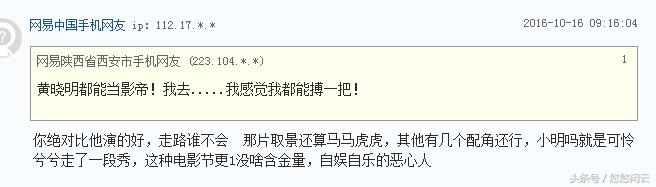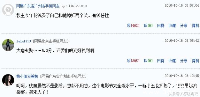 看到黄晓明拿影帝,有网友直接就说:教主今年花钱买了自己和他媳妇两个奖。有钱任性。想都不用想,这个电影节完全没水平,一群小丑互捧罢了,堪称吊丝的盛宴,笑死人了!娱乐圈真够乱的,这样的影帝,呵呵,含水量太多。更有网友说:2016年国产电影差评排行榜排名第四,评分5.1。黄晓明被点评为完全不适合角色的演员。呵呵,双双获奖!更有人觉得是艺术被强奸了。有网友还说:看到这个结果,早饭吐了一地。还好,小编到现在还没早饭……