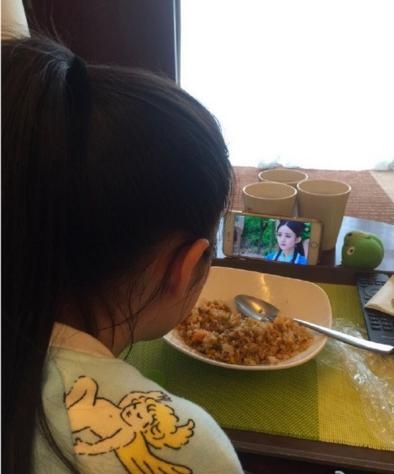 娜比连吃饭都不忘追自己大boss赵丽颖的新剧~