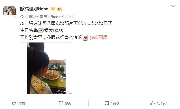 欧阳娜娜说:放一张迷妹照,因为没照片可以放...太久没见了,生日快乐,我大boss,工作别太累,我跟花妃会心疼的@赵丽颖