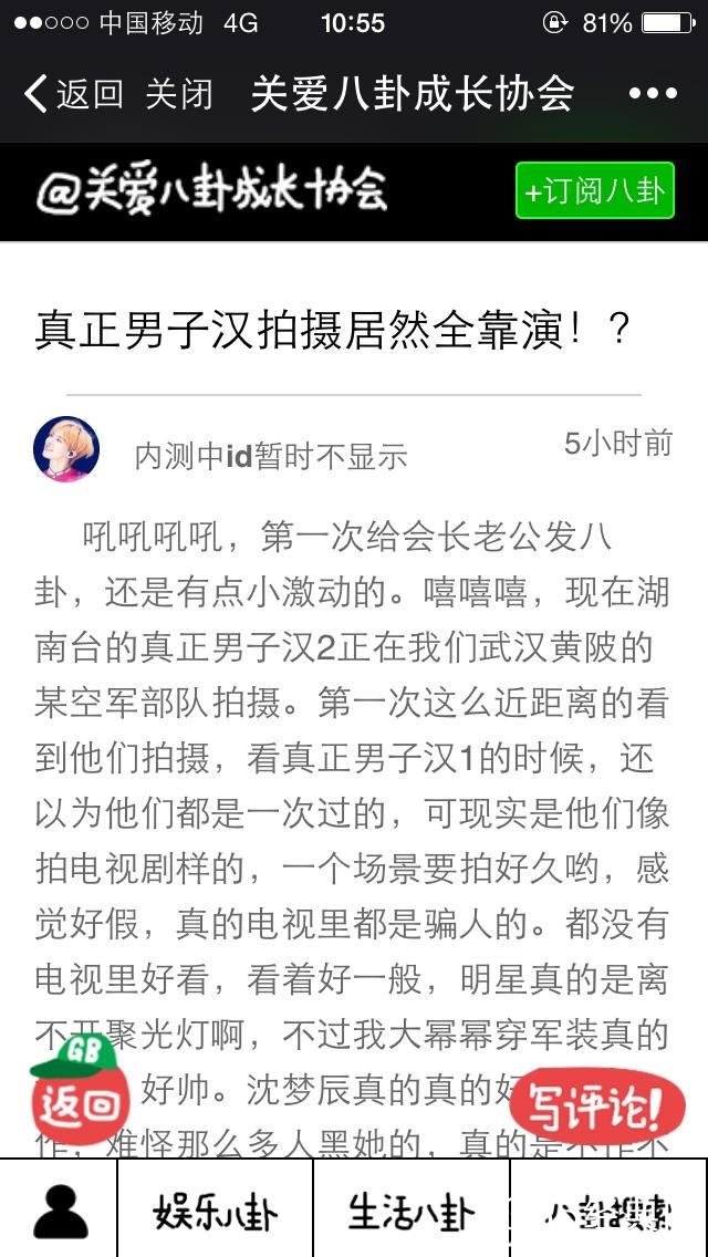 吼吼吼吼,第一次给会长老公发八卦,还是有点小激动的。嘻嘻嘻,现在湖南台的真正男子汉2正在我们武汉黄陂的某空军部队拍摄。第一次这么近距离的看到他们拍摄,看真正男子汉1的时候,还以为他们都是一次过的,可现实是他们像拍电视剧样的,一个场景要拍好久哟,感觉好假,真的电视里都是骗人的。都没有电视里好看,看着好一般,明星真的是离不开聚光灯啊,不过我大幂幂穿军装真的好美,好帅。沈梦辰真的真的好假,好作,难怪那么多人黑她的,真的是不作不死,一个从直升机下来的动作来了,搞了七八遍,一直笑场,摔倒时也好假,看着都替她累。佟丽娅很亲切,还和她说上了话,她经纪人也很好,和我们聊天,话说不都说经纪都很拽的的嘛,可他们都看着很好耶和传说的不一样。
