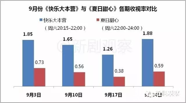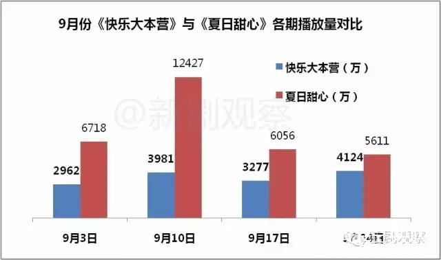 收视率方面,以9月份4期节目在CSM52城的数据为例,不出所料,《快乐大本营》以1.66%的收视率均值完胜《夏日甜心》0.56%的收视率均值。