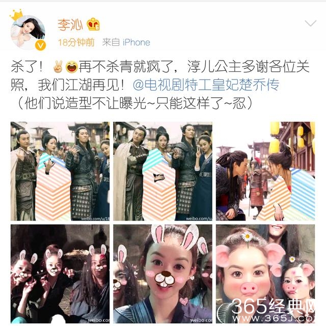 李沁发微博称《楚乔传》元淳公主戏份终于杀青了,并送上多人合照自拍!