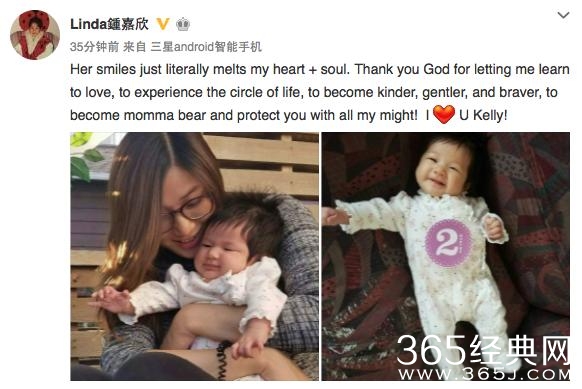钟嘉欣以英文留言说自己的心和和灵魂全被Kelly的笑容融化掉,同时感谢上帝让她学会爱、让她体验到生命的循环、令她成为亲切、温和、勇敢、用尽所有力量去保护女儿的母亲。