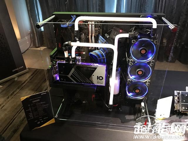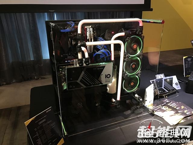 现场展出一套与Thermaltake超级合作DIY的水冷机,只要是Thermaltake家有的产品都用上了,甚至是键盘鼠标,配合上TT现在主打RGB灯效,整套机器光感动人。
