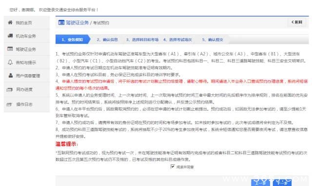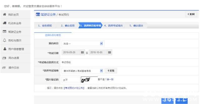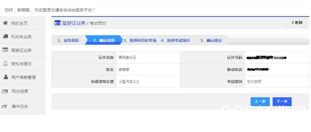 选择预约科目(科目一、科目二、科目三等),考试日期为当前日期第3天之后,选择考试场地,点击【下一步】
