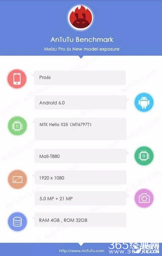 网上传出的安兔兔跑分认证资料显示,PRO 6s搭载联发科Helio X25处理器(MT6797T),屏幕分辨率1080P,摄像头组合为500万/2100万,4G/32G机身存储组合。