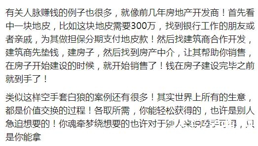 很多人说现在社会的人太精明了,根本就没有空手套白狼的机会。只是你狭隘的理解 了,空手套白狼 的本质,任何一个成功的空手套白狼,都是基于帮助 对 方利益最大化为基础而产生的,必须同时实现 多赢的局面。如果你抱 着 完全去套取别人的利益,自己i什么都不愿意付出,那你注定失 败