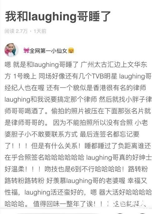 近日,有网友爆料香港已婚演员谢天华内地约炮,露骨尺度大到不可描述!该陪睡女网名为“全网第一小仙女”。自称并不想出名,只想和网友分享自己和明星亲密接触的愉快体验。不但在文中大尺度爆料称谢天华器大活好,而且称男方吻技六到不行,并说自己已经路转粉心已经被俘获羡慕谢天华老婆等语。让吃瓜群众看得无语。不少网友纷纷批评该陪睡女缺乏职业道德,表面称不想红,实际高级黑绝对心机婊。