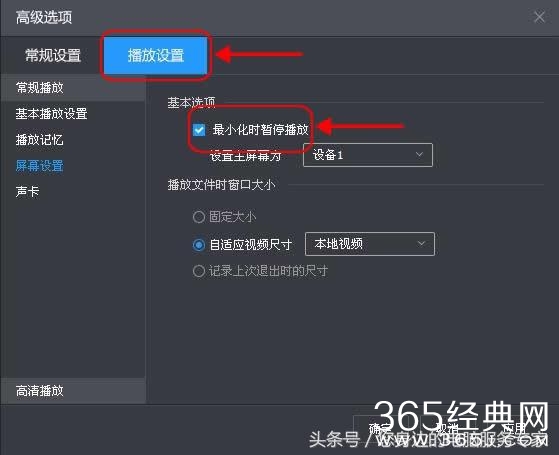 3、选择“播放设置”选项卡,勾选“最小化时暂停播放”。