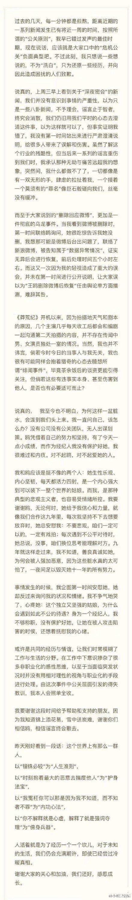 就在今天王鸥的经纪人公开发表了微博,表明自己之前的每一天都是莫大的煎熬,而且表明这次不是为了“洗白”,而是为了还原事情的真相。但是王鸥刘恺威这件事情已经过去了一个星期,选在这个时间再来解释是不是别有用心呢?
