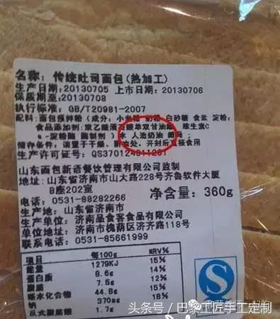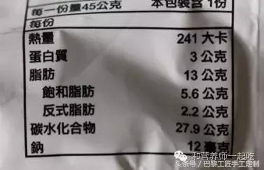 在一些包装袋的外面显示的配料表和营养成分表中,有显示“起酥油”“麦淇淋”“氢化油”“不饱和脂肪”“人造奶油”等与反式脂肪酸类似的名称,都要详细看看含量,含量超标的零食尽量就不要买了。另外,外表酥脆的膨化食品或者甜点,也一定程度上使用了“氢化植物油”,在购买时一定要注意。