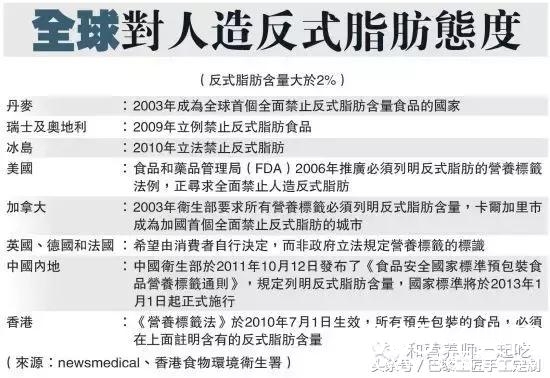反式脂肪酸的含量占总脂肪酸百分比牛奶、羊奶 3 % ~5 %反刍动物体脂 4% ~1 1 %氢化植物油 14.2%~34.3%起酥油 7.3%~31.7%硬质黄油 1.6%~23.1%面包和丹麦糕 37%炸鸡和法式油炸土豆 36%炸薯条 35%糖果类脂肪 27%