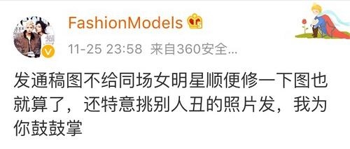 看样子应该是时尚博主吧,说:发通稿不给同场女明星顺便修一下图也就算了,还特意挑别人丑的照片发,我为你鼓鼓掌高端大气上档次的生日说说