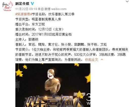 今日《喜剧总动员》即将迎来收官之战,好像大多数观众都还意犹未尽,不过不要紧,好消息接憧而至。经《欢乐喜剧人》官方及《剧星传媒》证实,《欢乐喜剧人》第三季回归东方卫视,并且在12月13日重磅来临。