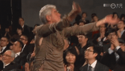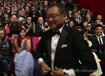 得奖后起身,先扣好了西服扣子,绅士风度。