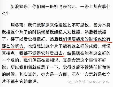 在新浪娱乐的专访里,周冬雨更实在,坦白她和马思纯都觉得命运不可思议,《七月与安生》拍的时候“没有那么努力”,“我都不觉得它能卖出去”。