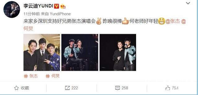 李云迪爆照说:来家乡深圳支持好兄弟张杰演唱会,昨晚很棒,何老师好年轻。网友回应说:哥,你的眉毛画的吼吼看。张杰哥哥是越来越好看了。