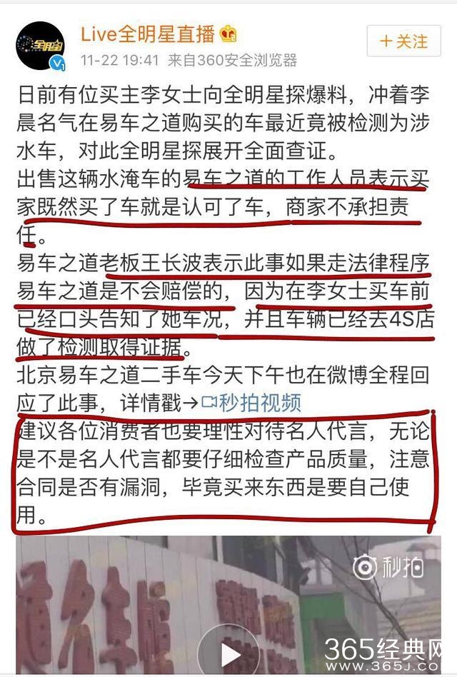 大概意思呢,就是网友李女士向“全明星探”爆料,称自己冲着李晨的名气,于今年4月在“大黑牛”李晨入股的汽车买卖公司“易车之道”购买了一辆保时捷。在销售过程中,对方从未告知该车为严重涉水车,当李女士在最近想将该车出手的时候,才在某4s店检测时得知真相。