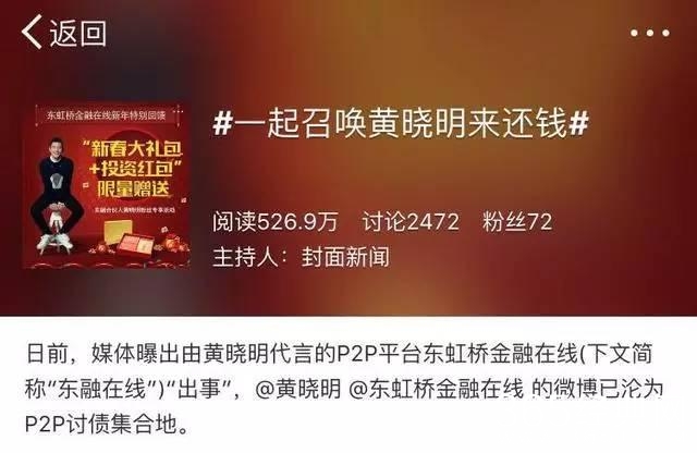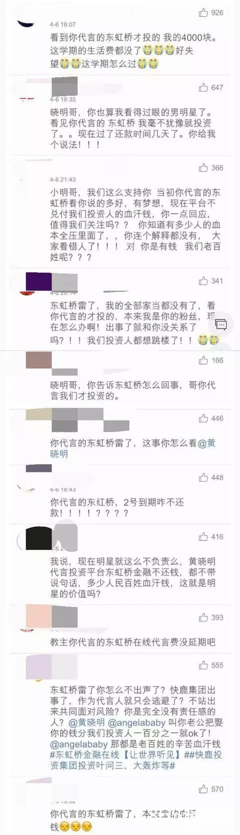 4月,由黄晓明代言的P2P平台东虹桥金融在线被曝“出事”,陷入兑付危机。广大“投资人”愤怒之情无处投诉,纷纷跑黄晓明微博“讨说法”。