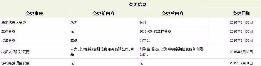 再看全国企业信用信息公示系统……信息显示,之前东虹桥的股东分别是上海隆钥金融信息服务有限公司、龚晶和朱力;而在今年5月30日之后,股东变更为上海隆钥金融信息服务有限公司、施燚和刘学会。