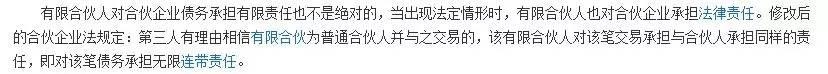 第一章《总则》的第二条是这么规定的,“有限合伙人以其认缴的出资额为限对合伙企业债务承担责任。”同时又规定,“第三人有理由相信有限合伙人为普通合伙人并与之交易的,该有限合伙人对该笔交易承担与合伙人承担同样的责任,即对该笔债务承担无限连带责任。”