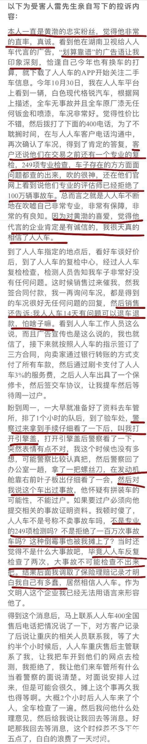 下边是雷先生讲述的投诉经过。倒霉的他多次强调自己“是黄渤的忠实粉丝”,觉得他“直率、真诚”,从而觉得他代言的“人人车”应该是有诚信的,才会很天真地相信了这家企业。