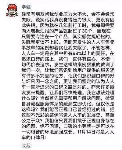 之前万般推诿的人人车官微写了一篇声情并茂的长微博,还称会将11月14日确定为人人车的“口碑日”。