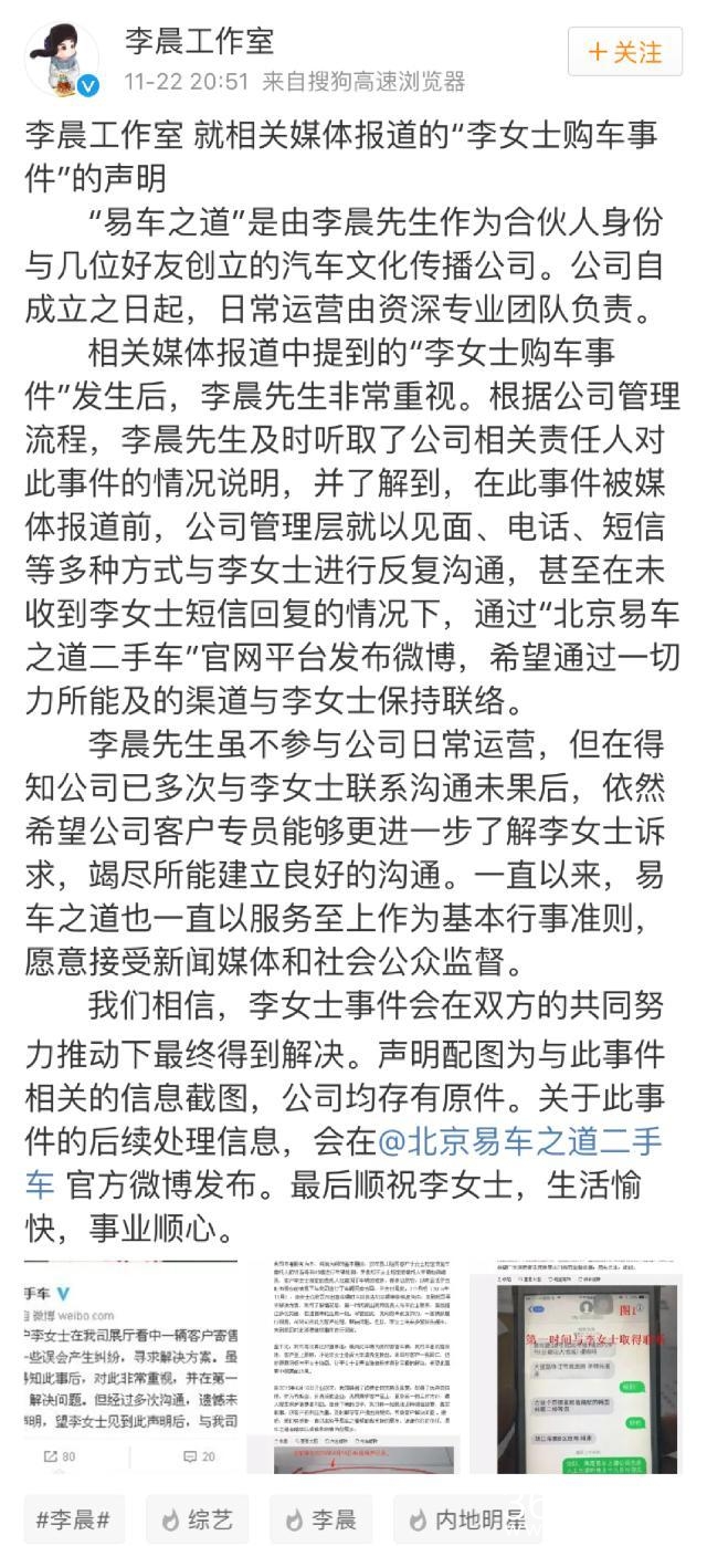 这时候危机公关拼的就是兵贵神速,李晨入股的公司“易车之道”官微以及李晨工作室官微都迅速做出了回应。