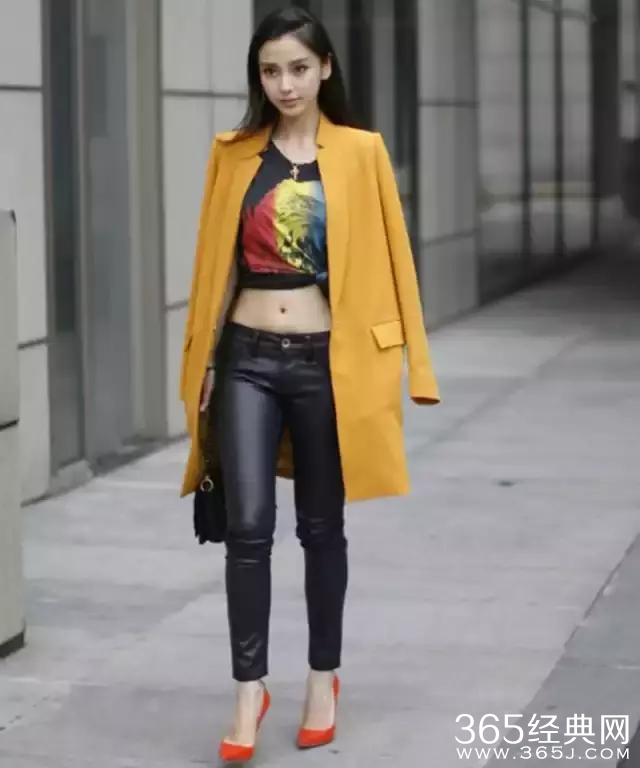 Angelababy杨颖的时尚街拍,红色高跟鞋与皮裤搭配,尽显时尚范儿。