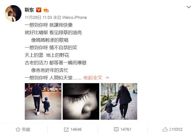 昨天,靳东在微博晒出与儿子手拉手的背影和儿子眼睫毛特写照片,并深情配上张惠妹《一想到你呀》歌词“一想到你呀,就让我快乐,就好比蜻蜓呀看见绿草的油亮……”表达对儿子的爱意。原来是靳东儿子生日,祝小天使生日快乐!睫毛那么长!小帅哥一枚鉴定完毕!