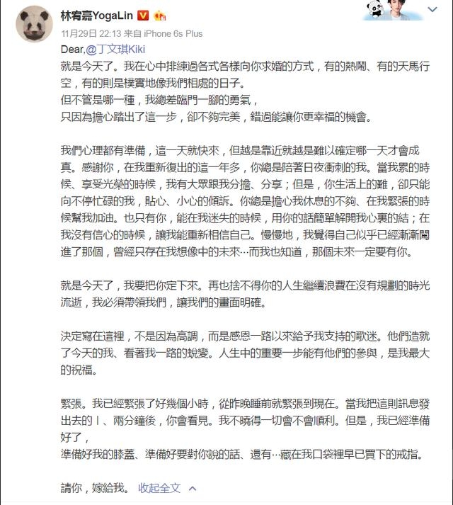 昨晚,林宥嘉在微博发长文向女友丁文琪求婚,深情告白“就是今天了,我要把你定下来”,并称自己已经准备好膝盖和戒指。一小时后,他又再次晒出两人甜蜜相拥的照片,表示求婚成功。祝福!比林宥嘉大3岁的丁文琪是歌手出身,之后淡出演艺圈,开了家咖啡店。林宥嘉复出前后,她一直温暖陪伴着。这狗粮,你吃了吗?