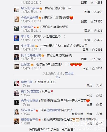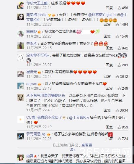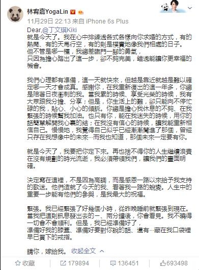 11月29日 22:13林宥嘉在微博上发了一篇长文,向丁文琪微博求婚!在一个小时之后再次发博道:她说好...