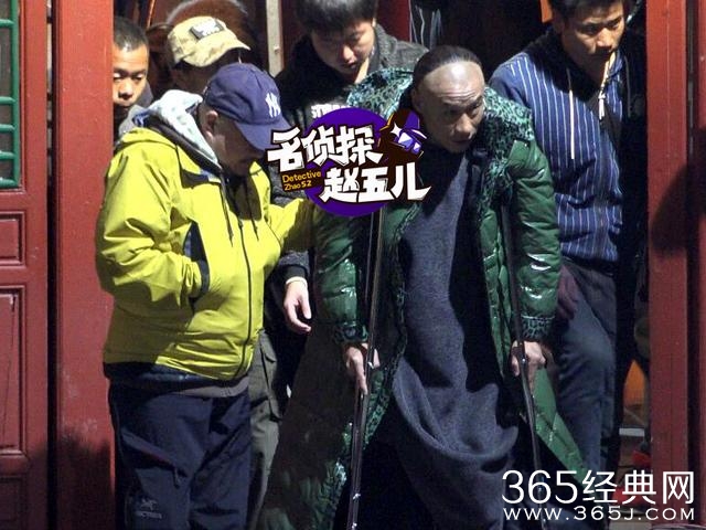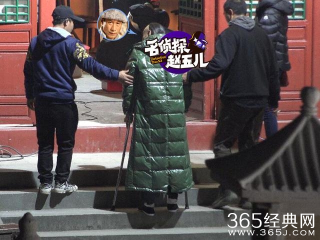 不一会儿,老戏骨刘佩琦大老远拄着个双拐走了过来,穿着绿色的超长羽绒服,在两名工作人员的看护下缓慢前行,疑似在拍摄当中受伤。