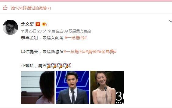 11月26日,周冬雨和马思纯双双拿到金马影后,兴奋的小蝌蚪在颁奖晚会上见到余文乐后,两人紧紧拥抱在一起,看得粉丝又是直呼赶快在一起。当天晚上,余文乐一口气更新了两条微博,都是祝贺小蝌蚪获大奖的。