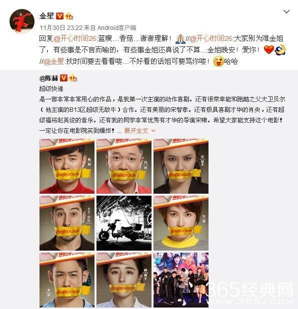 半个娱乐圈明星都转发了陈赫宣传新电影的那条微博,金星也不例外,还调皮称“找时间要去看看咯,不好看的话姐可要骂你咯”,之后,有一网友评论称:大家别为难金姐了,有些事是不言而喻的,有些事金姐还真说了不算,金姐晚安!爱你!金星本人随即连带宣传电影的那条微博一起转发,并称“蓝瘦,香菇,谢谢理解!”