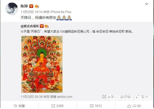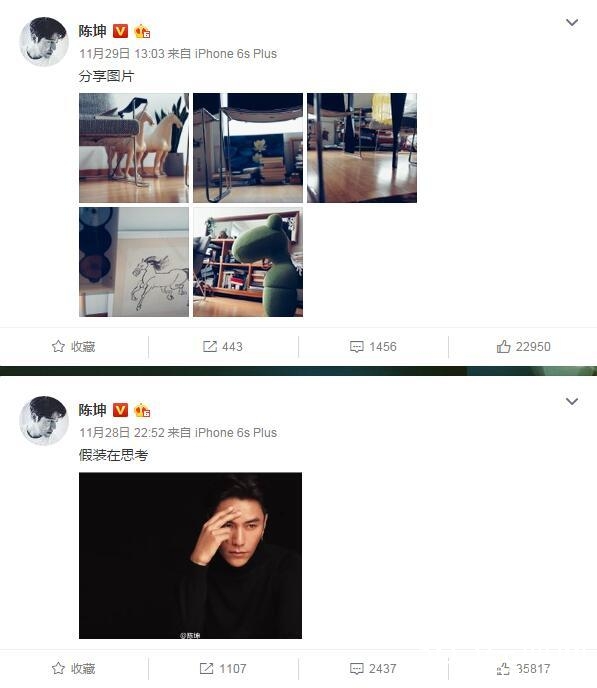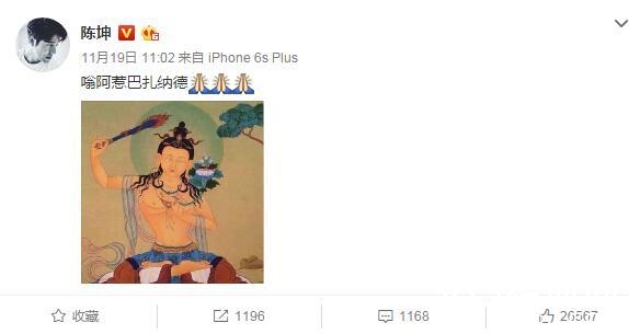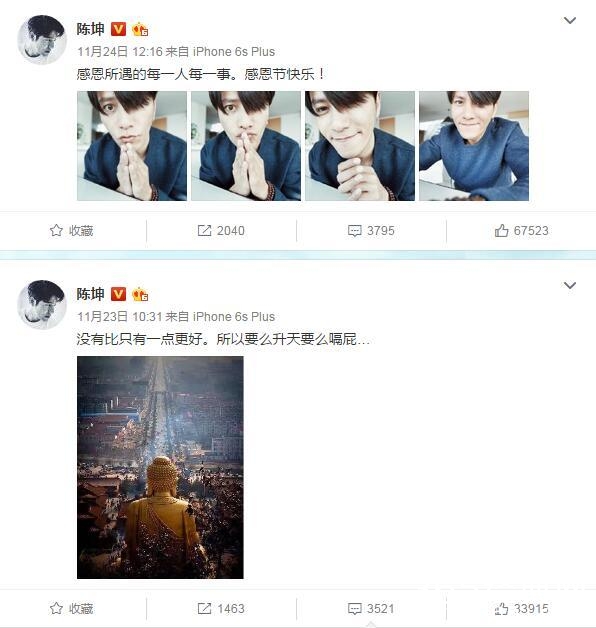 愚乐随便翻了一下陈坤这大半个月的微博,跟许多明星晒孩子,秀恩爱不同,陈坤的内容更多让人感到孤寂:人生感慨、佛像或者路边风景,也是不能晒儿子,也不能晒孩他妈。