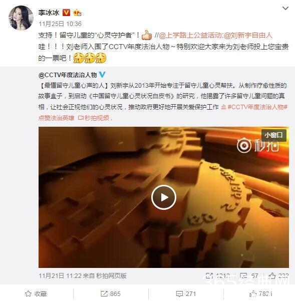 说完男的,再来看看另一位女星李冰冰,虽然她微博内容看起来比较阳光,但大都是感叹社会的各种事件,或者晒晒风景照片,虽然说明星支持公益是正能量,但是不是太过单一了?或许个人情感是空白的,为了维护微博人气发的内容都很勉强。