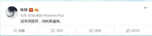 今天上午,陈坤发了一条只有十个字的微博:“诚信很脆弱,消耗需谨慎”。随即粉丝热议:坤哥咋了?谁和你不诚信了?甚至有网友开玩笑说:“坤哥谁借你钱不还了?我帮你摆平”!