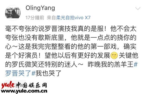 都说这个男生“眼里有长江”,哭的很有层次,不同的时期不同的心理状态通过不同的哭戏来表现,隔着屏幕都能感受到罗晋的真情实感和悲伤,不得不说罗晋的演技小编是服的,再看看网友们都怎么说的:“他不会太夸张没有歇斯底里,他就是一点点的挠你的心”,“罗晋的演技是你能隔着屏幕,感受到他痛彻心扉的苦”,“把自己导入环境中,步步深入,步步绝望,太赞了,哭的绝望,哭的心痛”,“被羔羊王的哭戏虐伤,需要他的一笑苏星星眼宠溺脸来治愈!”