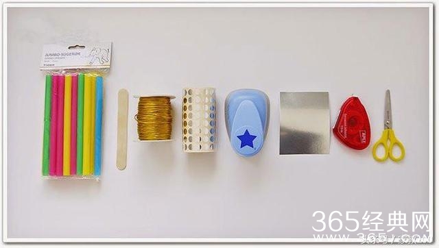 吸管,废弃冰棒棍或者普通竹棍,彩线,贴纸,打孔机,亮卡纸,胶带,,剪刀