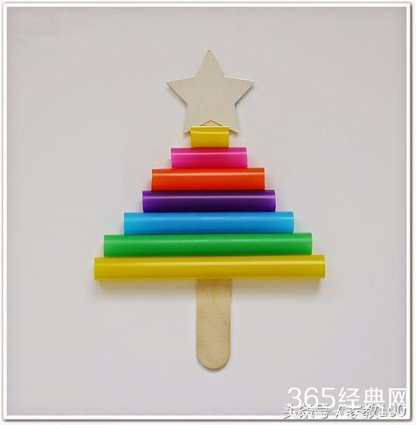 第三步:把彩色的吸管剪成不同长度的短管,并按长短排列呈三角状,贴在五角星的下方。