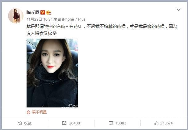 最近,陈乔恩在微博晒了一张自拍照,称自己有时候V脸有时候圆脸。