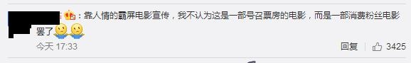 不过有位粉丝:靠人情的霸屏电影宣传,我不认为这是一部号召票房的电影,而是一部消费粉丝电影罢了。