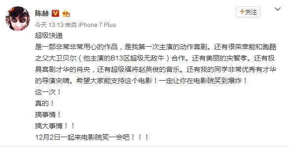 今天陈赫在微博宣传他的新电影,而他的一众好友也转发了微博帮其宣传。