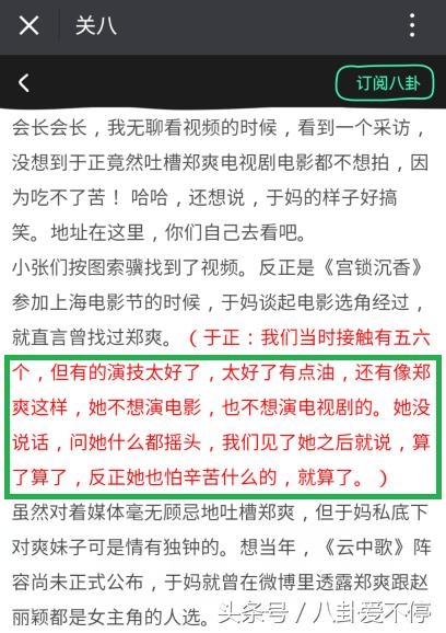 感觉郑爽不是吃不了苦,可能就是不想出演于正你的剧吧,纯碎个人观点,不喜勿喷。
