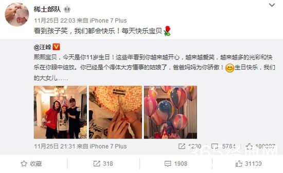 汪峰也在微博晒出他与章子怡及小苹果的合照,祝福女儿11岁生日快乐,称“这些年看到你越来越开心,越来越爱笑,越来越多的光彩和快乐在你眼中绽放…爸爸妈妈为你骄傲!”随后,章子怡转发汪峰微博,写道,“看到孩子笑,我们都会快乐!”