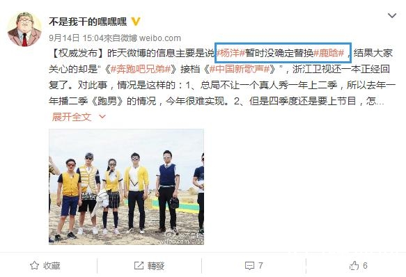 其次,就是我们傻袍子鹿晗啦~有消息称鹿晗将被替代,鹿晗因新片档期问题将无法出演跑男,代替鹿晗的将是人气演员杨洋。当然,此条消息还处于待确认状态~
