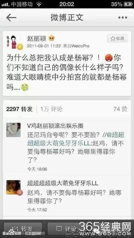 她曾被人认成杨幂,当时特别生气的发了微博,“难道大眼睛梳中分拍宫的就都是杨幂吗…”被网友骂惨,黑了很久。