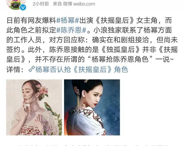 此外,陈乔恩接触的是《独孤皇后》并非《扶摇皇后》,因此并不存在所谓的“杨幂抢陈乔恩角色”一说。