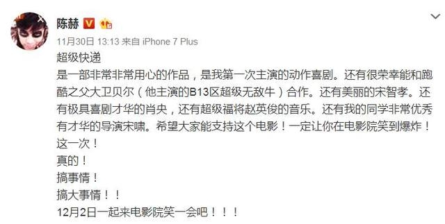 昨天,陈赫发了一条微博帮自己的新戏做宣传。